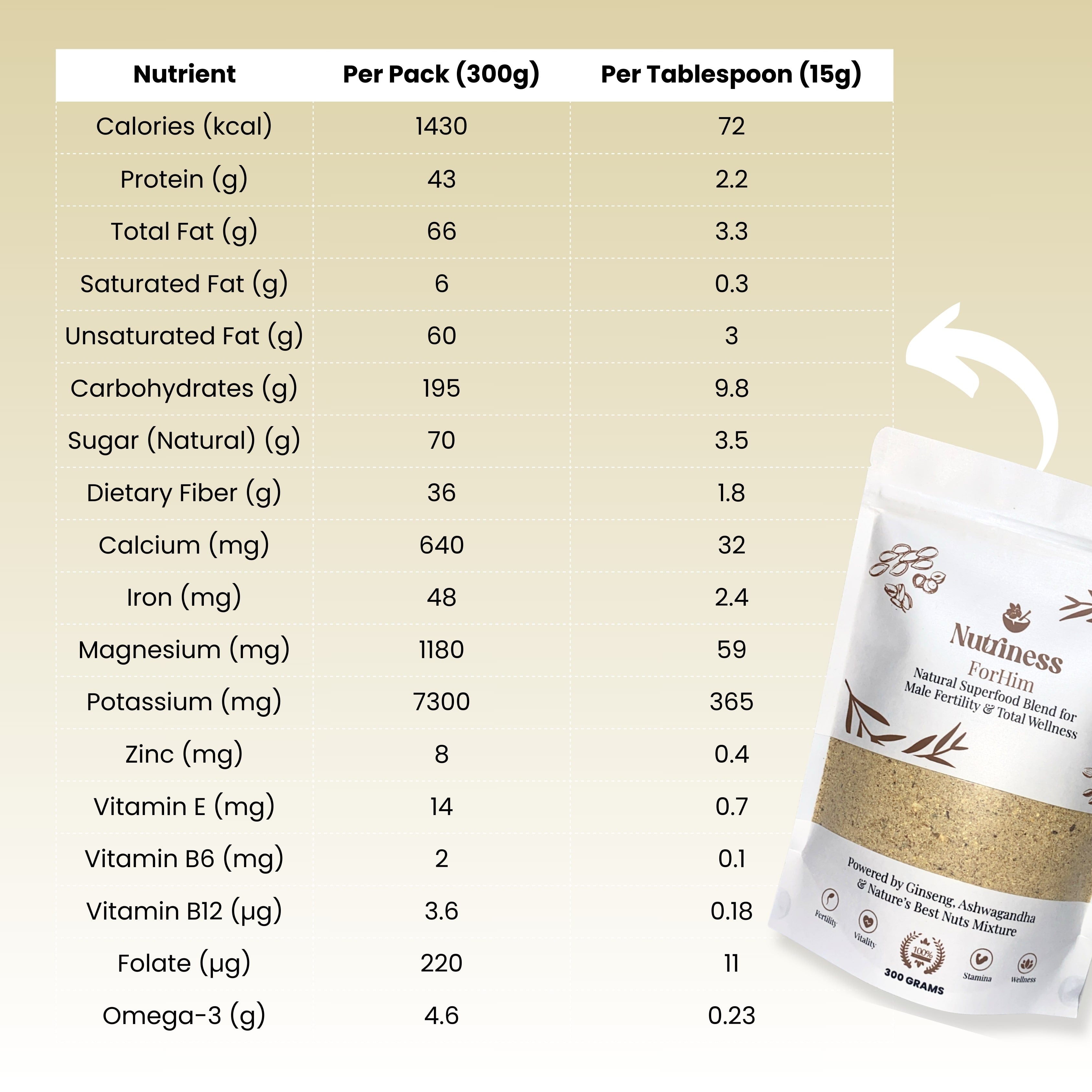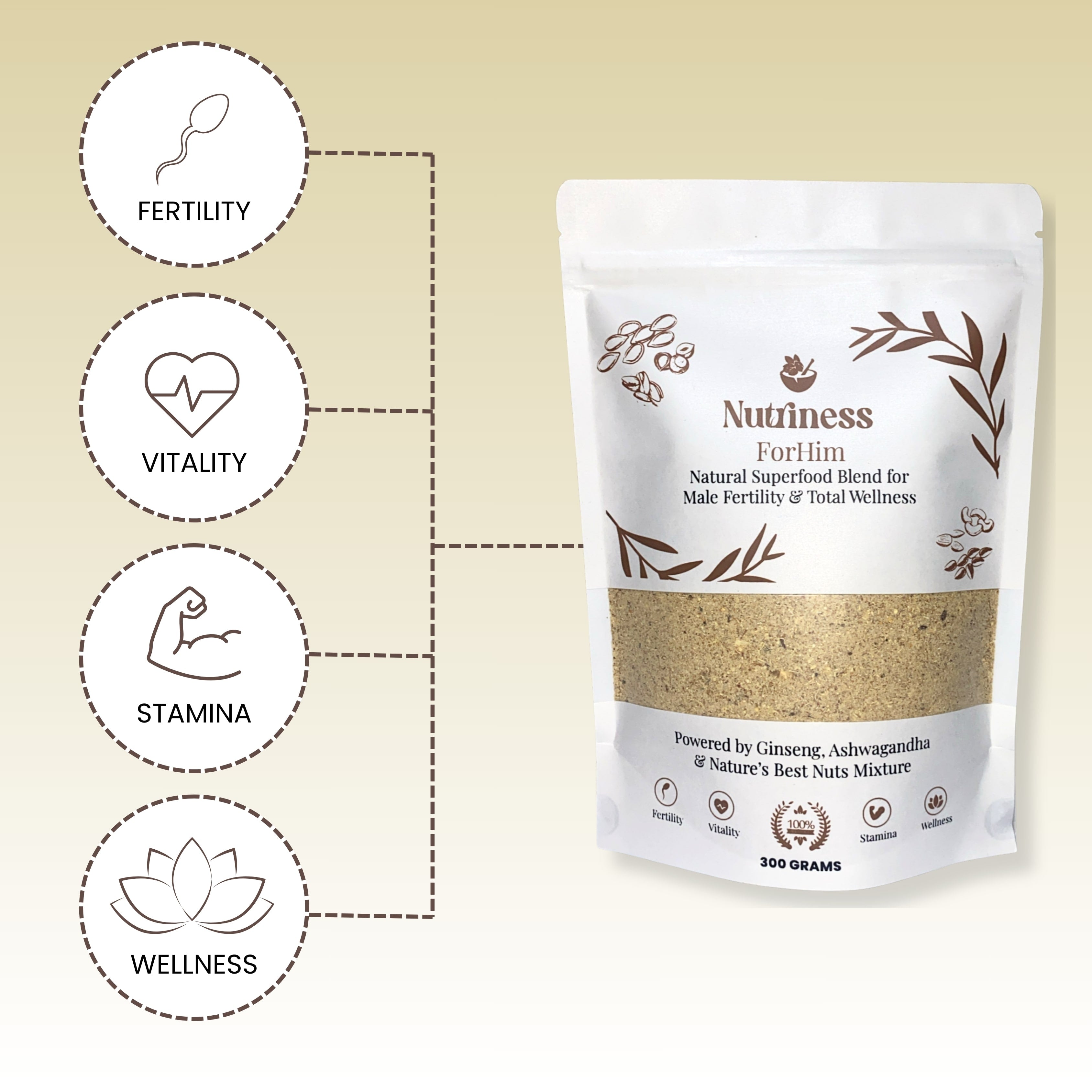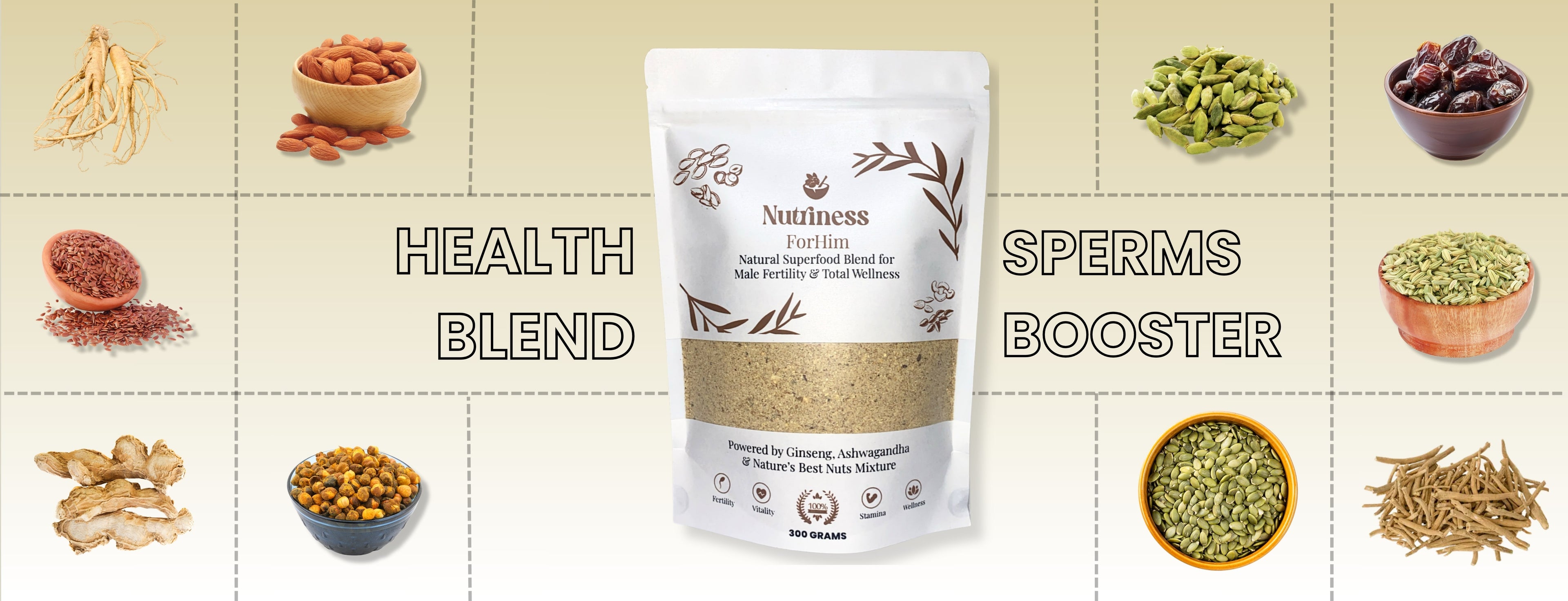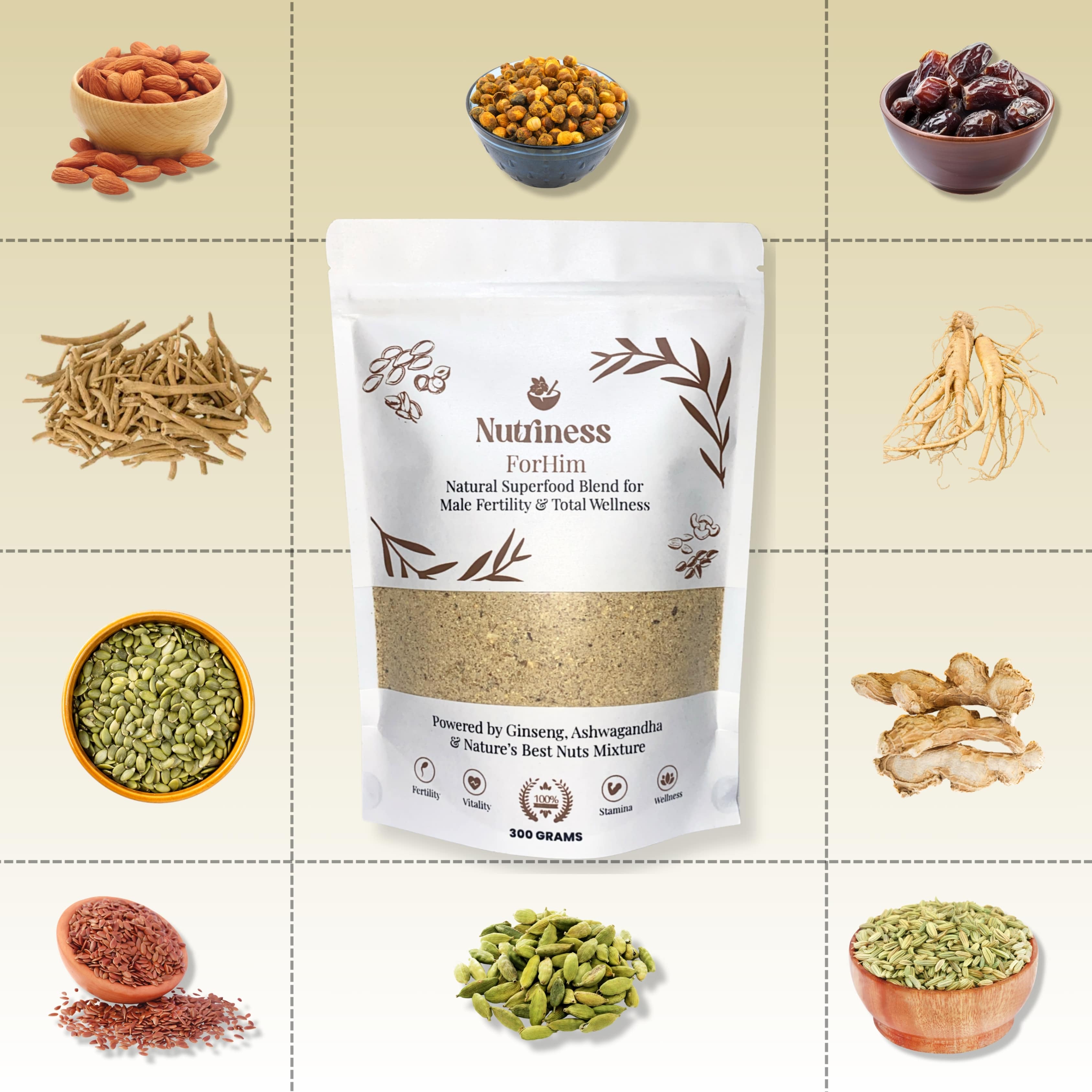 Nutriness ForHim is crafted with a powerful blend of carefully selected natural ingredients, including energy-rich dry fruits, potent herbs, and nutrient-dense seeds. Each ingredient plays a vital role in supporting male vitality, enhancing stamina, and improving reproductive health. From the strength-boosting properties of almonds and dates to the fertility-enhancing benefits of ginseng and ashwagandha, this blend is designed to help men feel their best, every day.