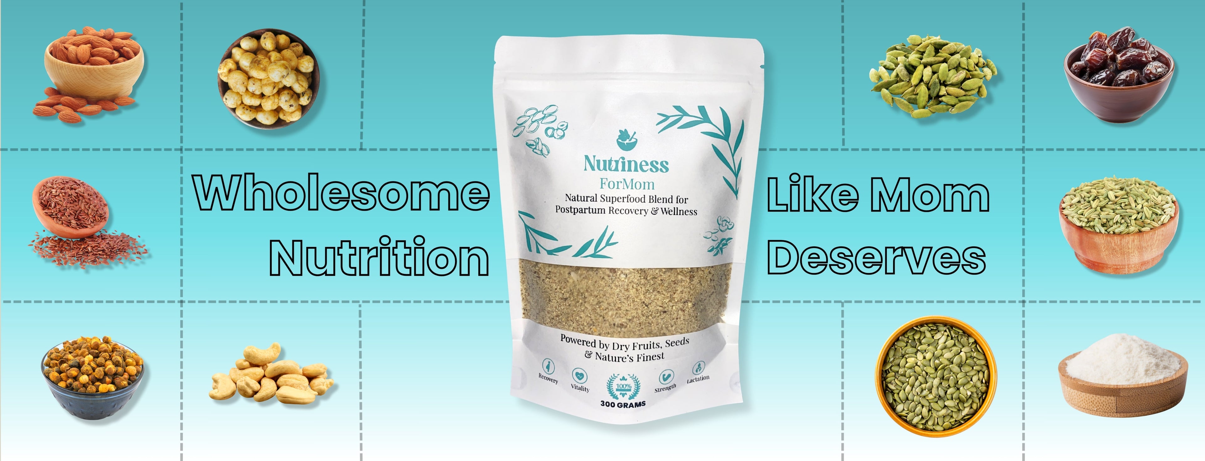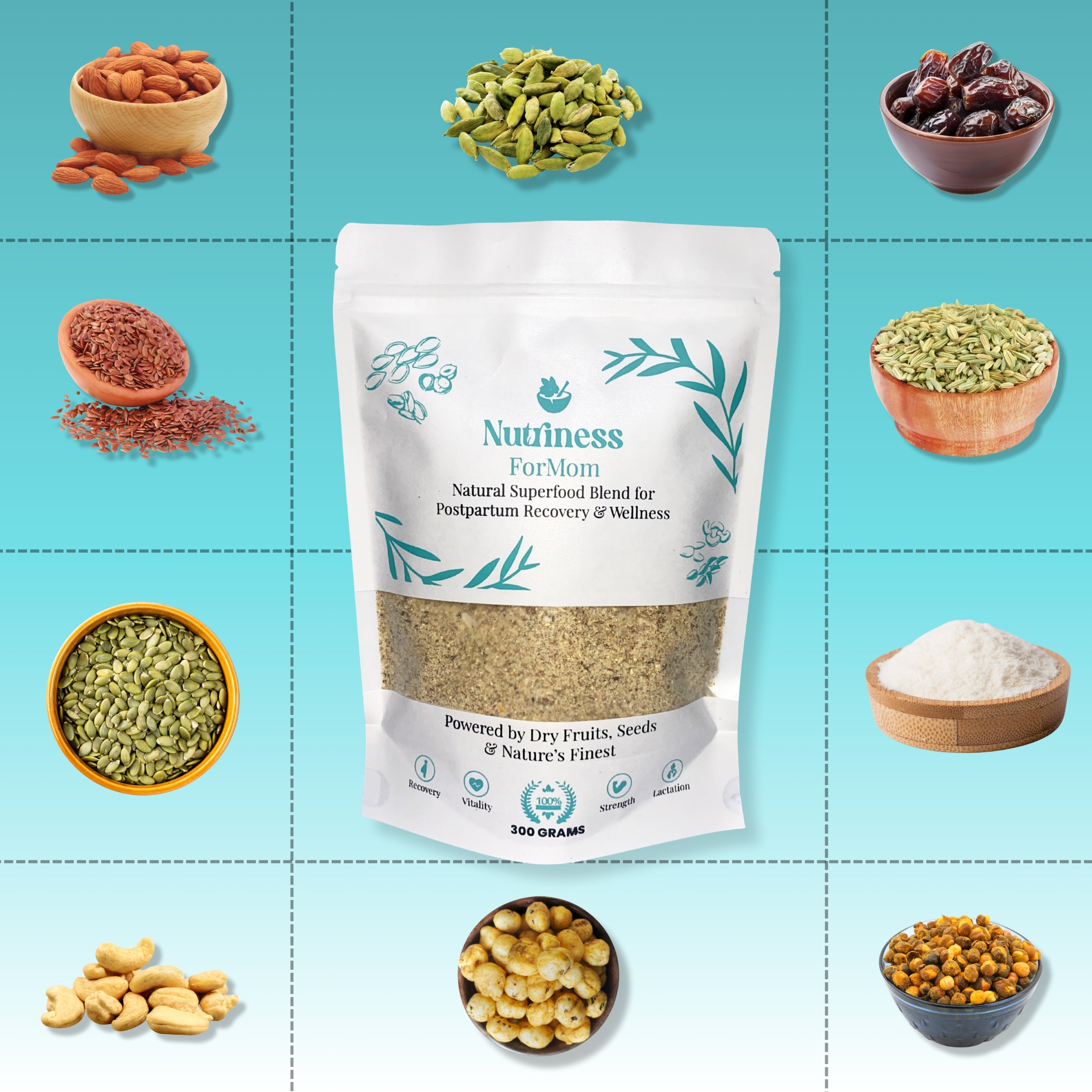 Nutriness ForMom is a nourishing blend of traditional postpartum superfoods designed to help new mothers regain strength, energy, and vitality. Enriched with dry fruits, seeds, and aromatic spices, it provides essential nutrients for recovery, hormonal balance, and overall wellness — while supporting lactation naturally.